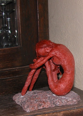 Kolejna praca sfotografowana na tle tychże, bo i tematycznie pasująca, ciemnu w kolorystyce anioł, zdjął aureolę i spogląda na nią jakby zastanawiał się co to jest? A może myśli zupełnie inaczej. jak sądzicie?